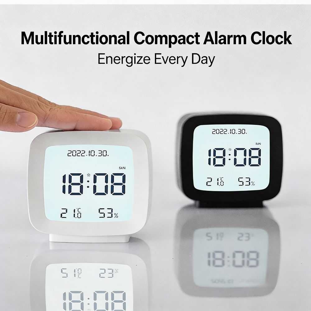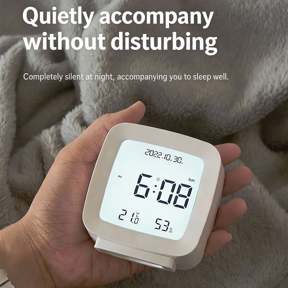 Modern Portable LCD Digital Alarm Clock with LED Display Shows Indoor Temperature & Humidity Room Bedroom Decor for Desks Tables