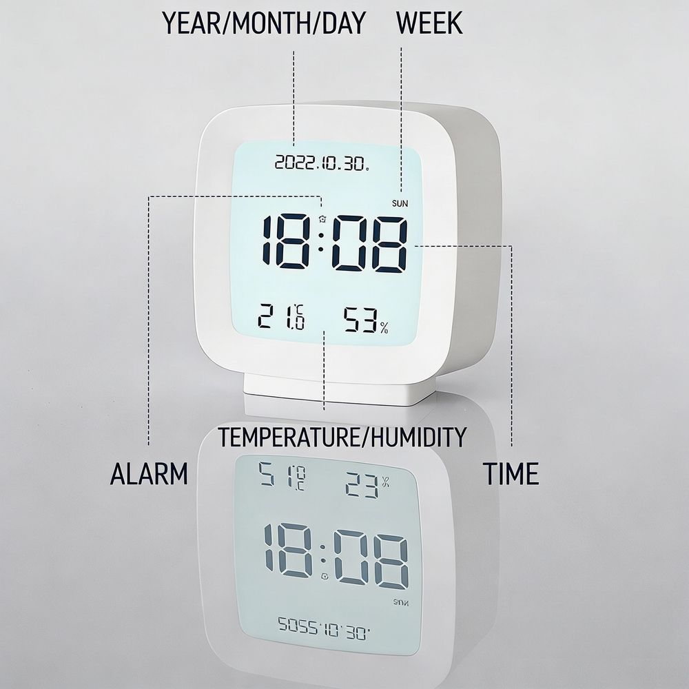 Large LCD Screen – Clear display of time, temperature, and humidity